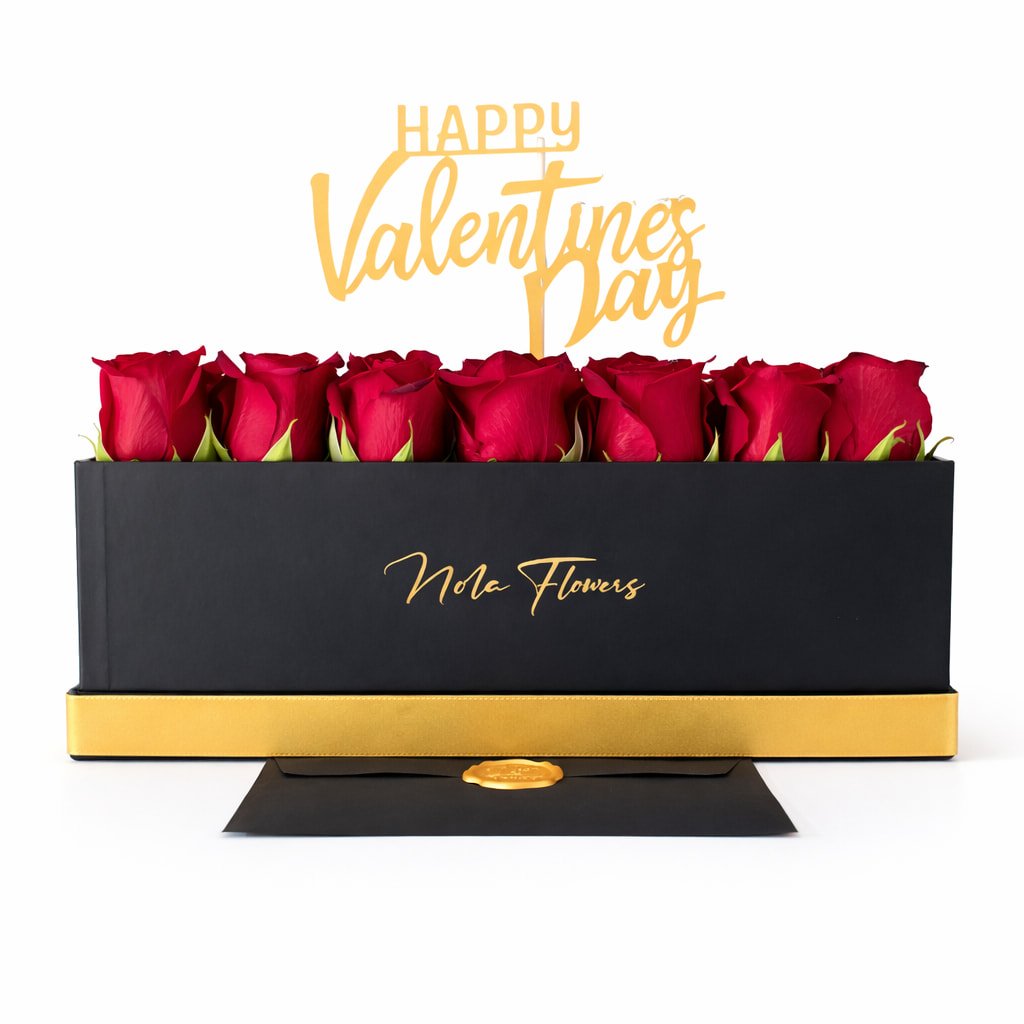 A Valentine-themed topper completes the gift, with message options such as Happy Valentine’s Day, I Love You, Forever Yours, or With Love. The box is finished with our signature gold ribbon and includes a complimentary message card enclosed in an envelope, giving you the opportunity to add your own personal words.