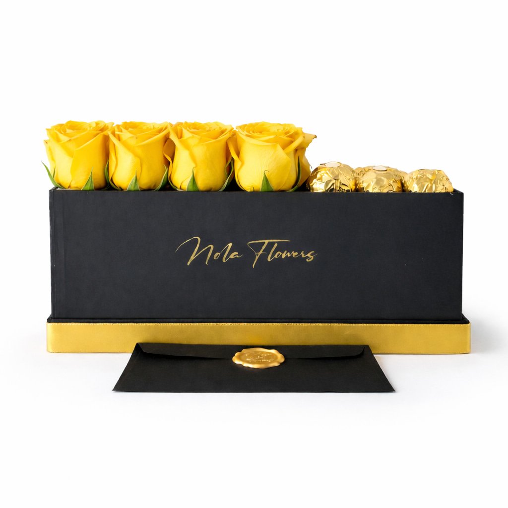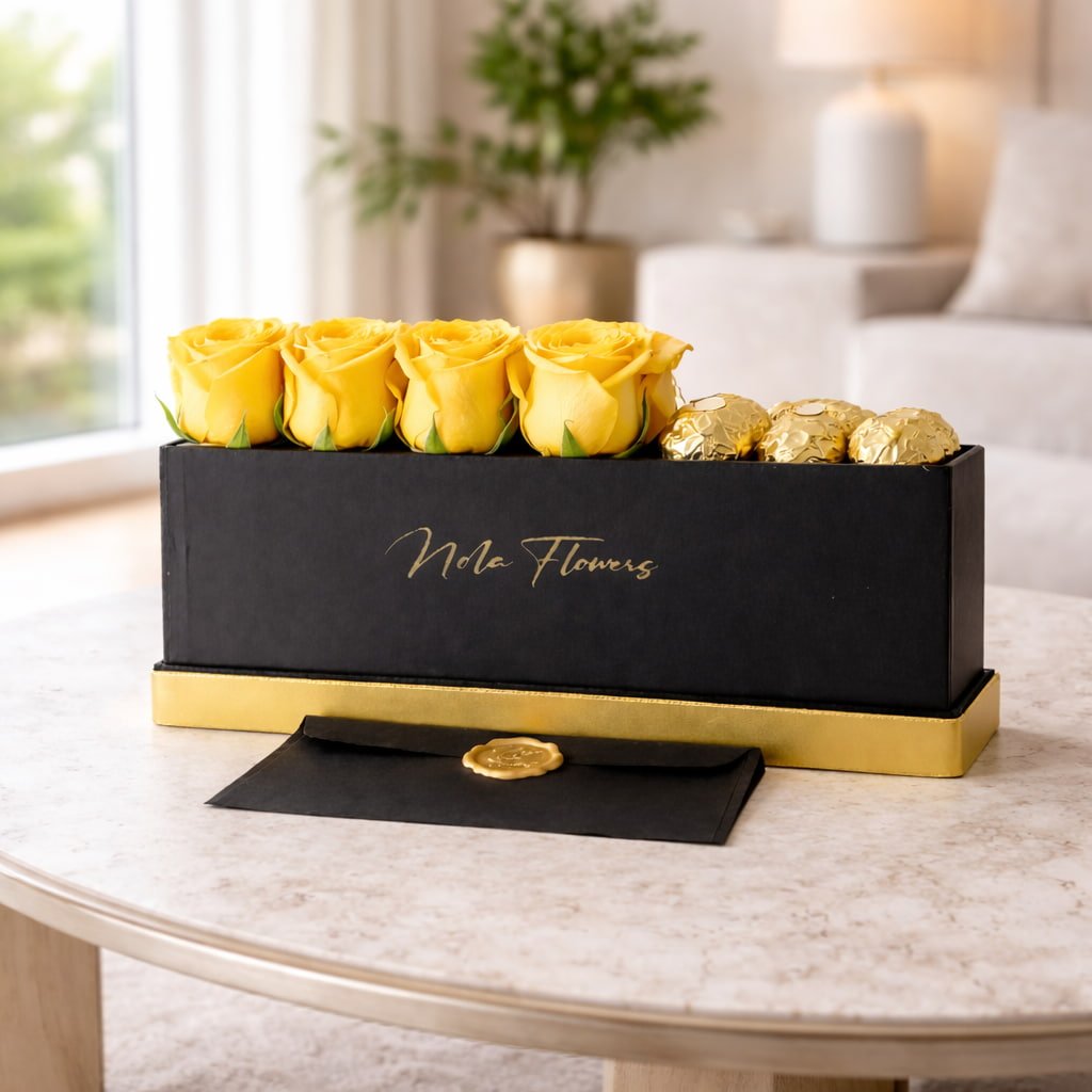 A radiant arrangement of premium yellow roses presented in a luxury flower box, complemented with Ferrero Rocher chocolates and finished with an elegant gold ribbon. Designed to celebrate appreciation, strength and achievement this International Women’s Day. 🌼 Designed exclusively for International Women’s Day – Limited seasonal availability.