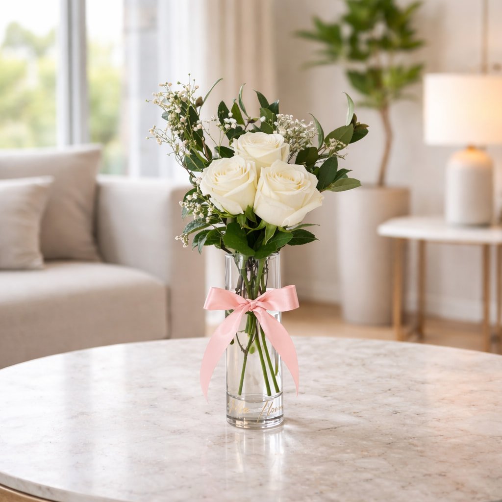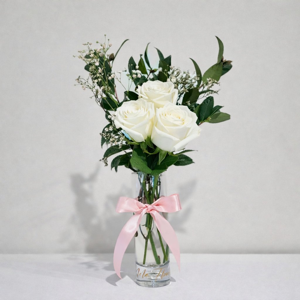 Ivory Grace is a minimalist arrangement featuring three premium long-stem white roses, carefully styled in a sleek clear glass vase. Accented with fresh seasonal foliage and delicate filler flowers, this design is finished with a soft pink satin ribbon for a refined, feminine touch.
